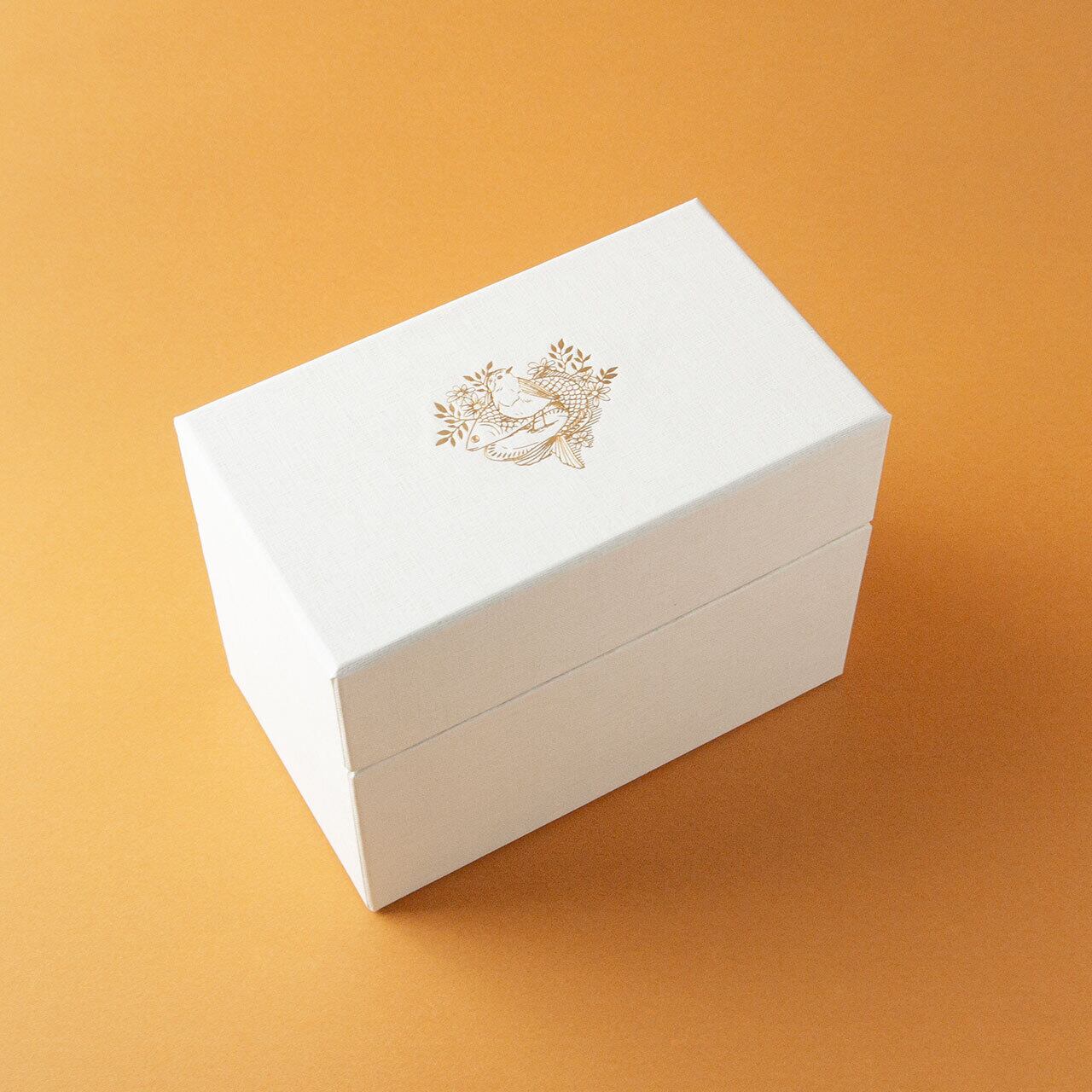 ・ボックスはしっかりと厚みのあるホワイトの紙製で、蓋にゴールドの箔押しでワンポイントが施されています。W168mmxD98mmxH128mm